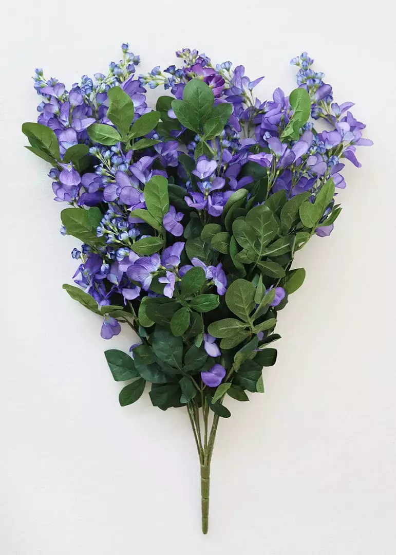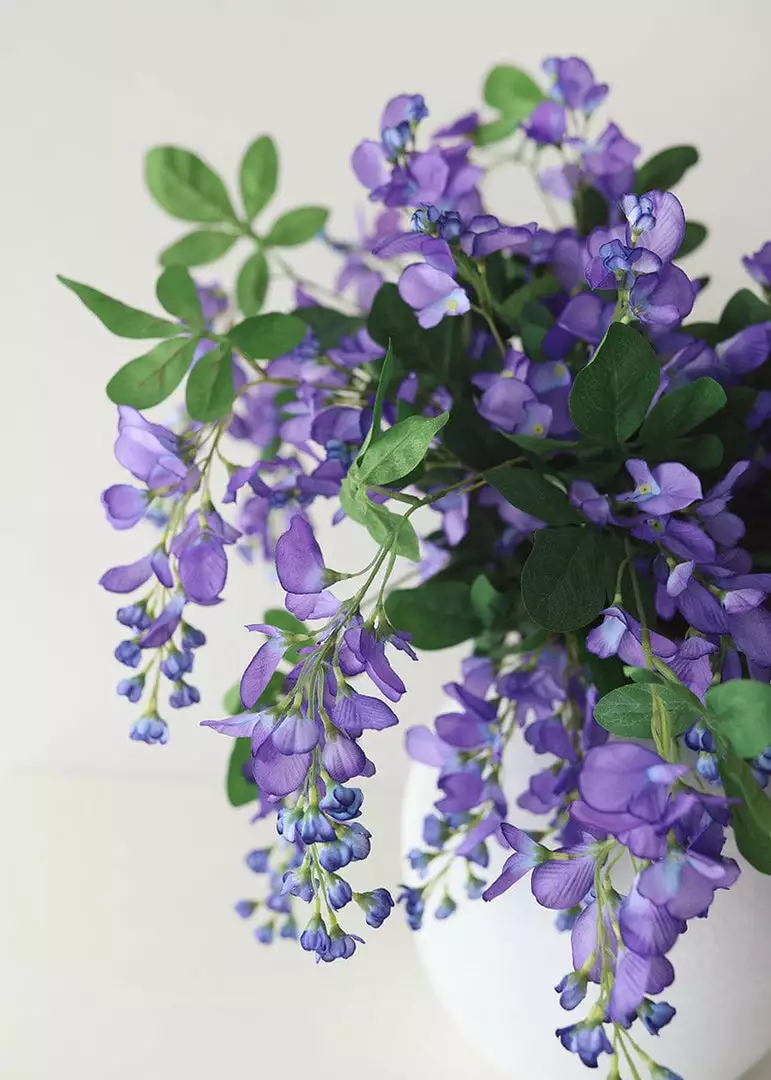 Transform your wedding venue into a garden filled with draping vines of violet and deep green. This artificial violet blue silk hanging wisteria bush is an elegant way to create cascades of flowers and lush greenery for any special occasion. The delicate silk petals offer multi-dimensional coloring that mimics the indigo, lavender, and deep hues of a true wisteria plant.