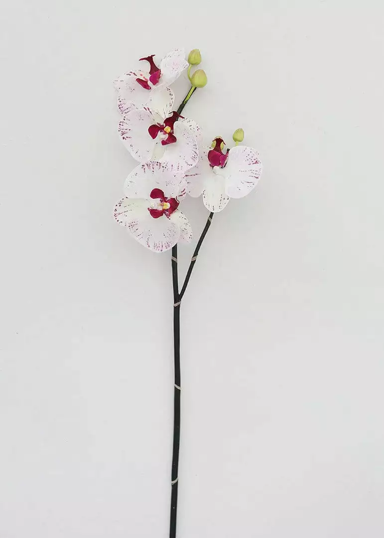 Elevate your silk flower arrangements with nature-inspired faux botanicals like this simply beautiful phalaenopsis orchid spray. Its artificial flowers are white with splashes of plum purple.